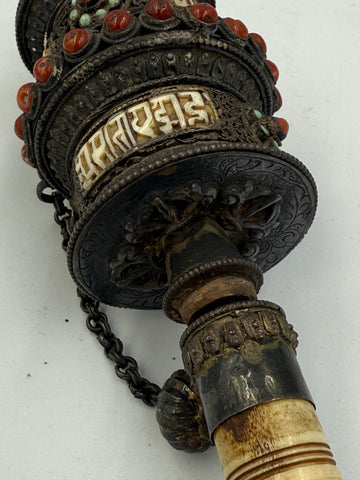An excellent antique Tibetan prayer wheel in solid silver set with turquoise and coral gemstones, bone handle. Good condition with heavy patina, scroll inside. 12.75” long.